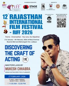 The 12th edition of the Rajasthan International Film Festival (RIFF), recognised by the Federation of Film Societies of India (FFSI) North Region, and organised with the support of the Rajasthan Tourism Department, Department of Art and Culture Government of Rajasthan and in association with Stage OTT will be held from 31 January to 4 February 2026 at Miraj Cinemas, Bluecity Mall, Jodhpur, Rajasthan. The theme of RIFF 2026 is “Cinemasthan – Your Lens, Our Rajasthan.” The festival will also mark a decade of RIFF’s successful journey in promoting cinema in Rajasthan.